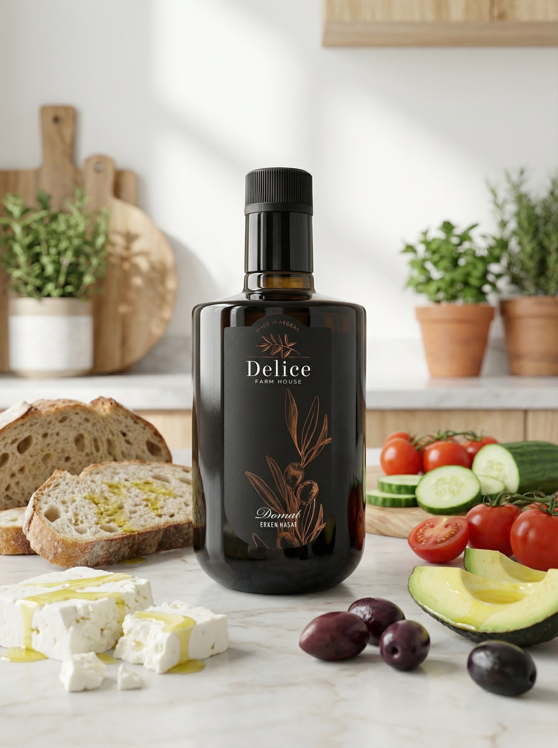 Domat Erken Hasat Natürel Sızma Zeytinyağı, Bayındır bölgesinde yetişen Domat zeytinlerinin Eylül–Ekim döneminde elle hasat edilip 22 °C’de soğuk sıkım yöntemiyle işlenmesiyle elde edilir. %0,2 asit oranına sahip bu erken hasat zeytinyağı; yeşil elma, taze badem, çimen, enginar, roka ve domates yaprağı notalarıyla canlı, ferah ve dengeli bir aroma sunar.